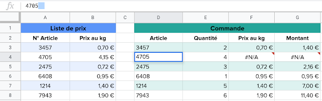 En ajoutant une colonne "N° Article", la colonne "Prix au kg" n'est plus incluse dans la recherche, le prix est donc totalement incohérent car la fonction récupère un numéro d'article et donc le calcul du montant devient impossible.